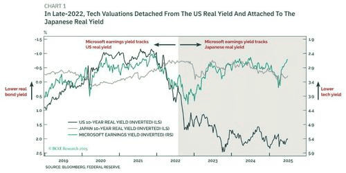 BCA Research的分析显示,2019年至2022年期间,美国科技股估值与美国实际债券收益率保持完美同步。